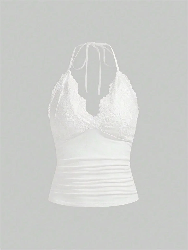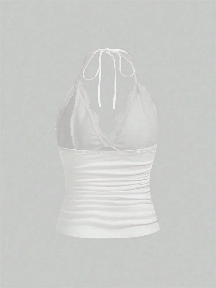 Goth Grunge Punk Black Lace Patchwork Halter Top Women Summer Solid Ruched Backless Sleeveless Tank Top Streetwear Y2K Clothes